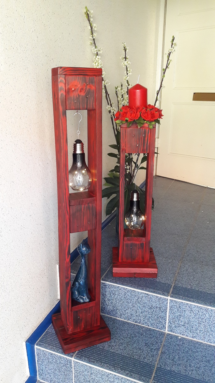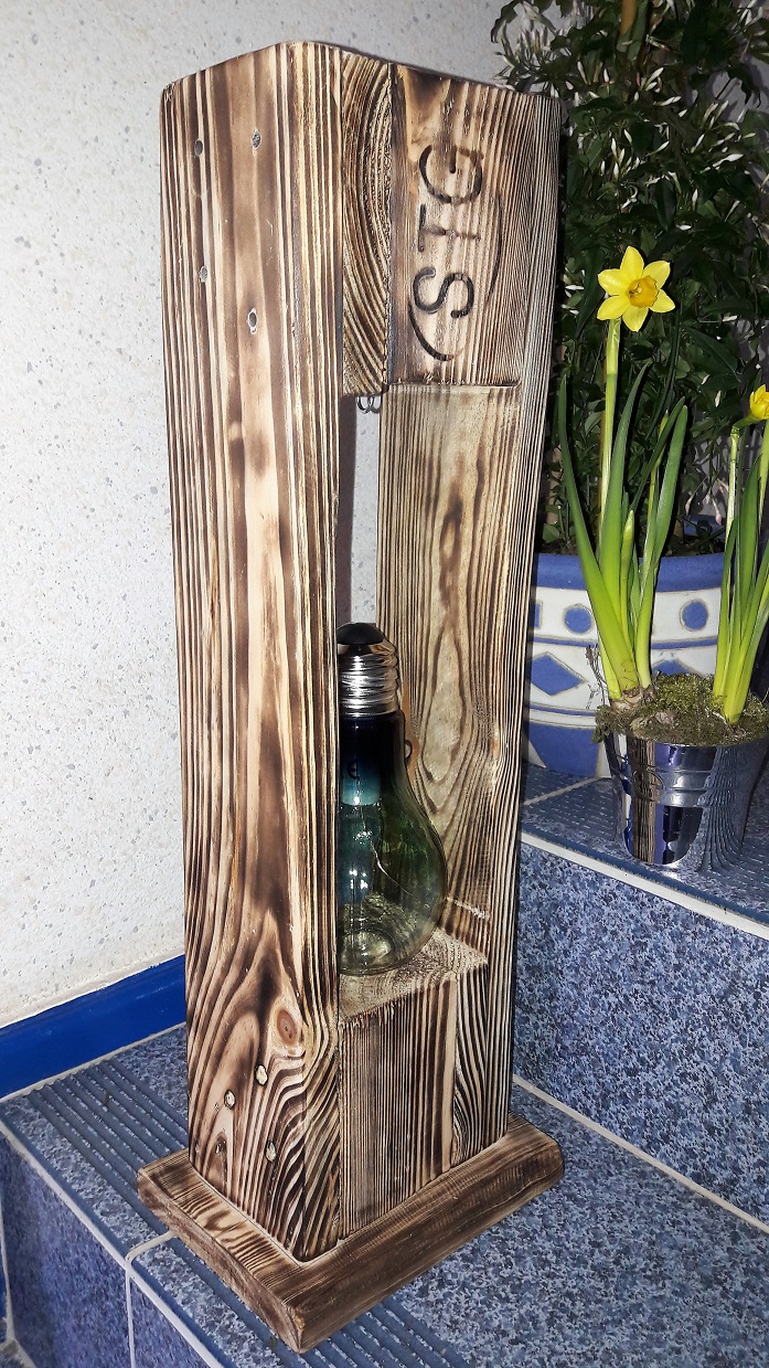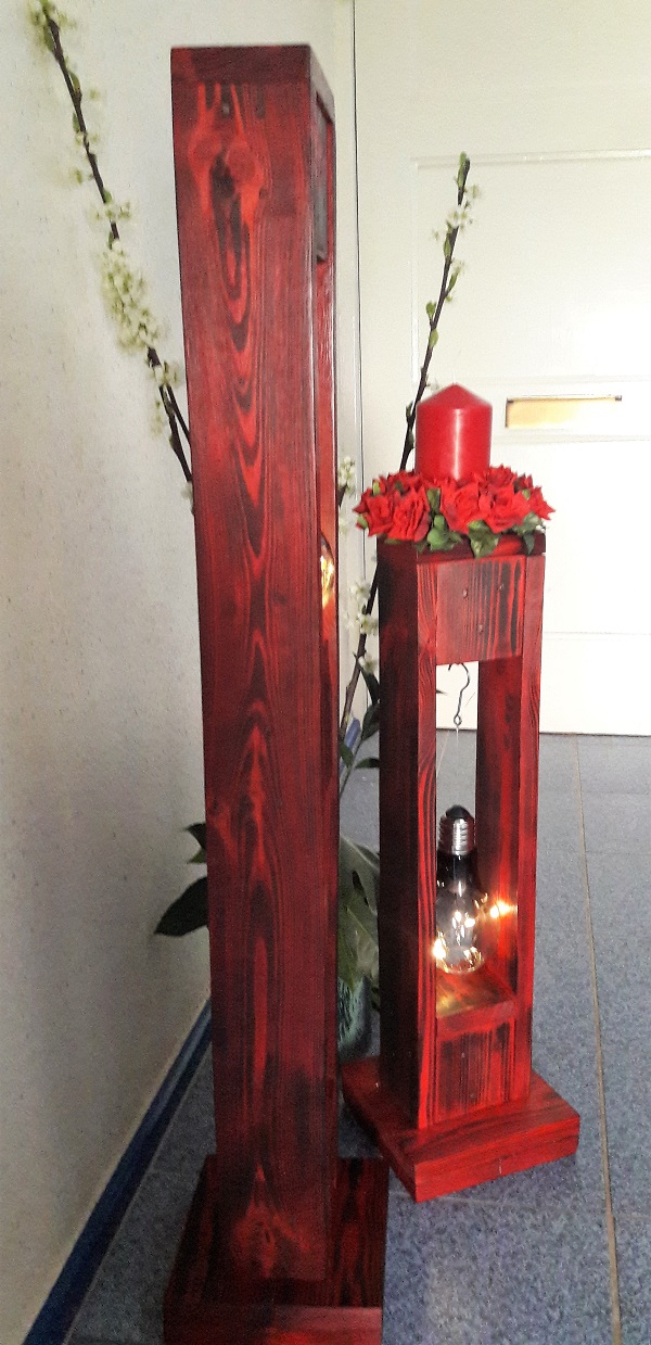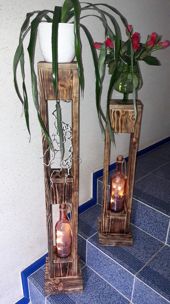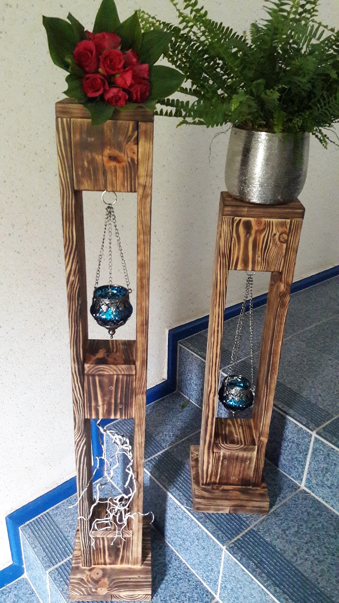 ![]() ![]() Auch die Teelichthalter und der Blumenhalter wurden aus alten Paletten gefertigt. |