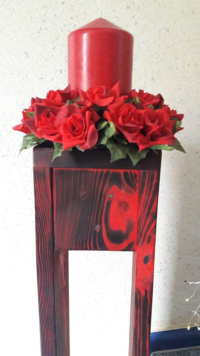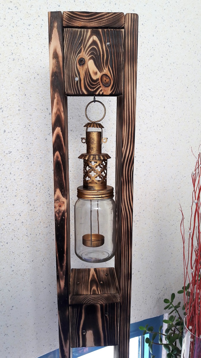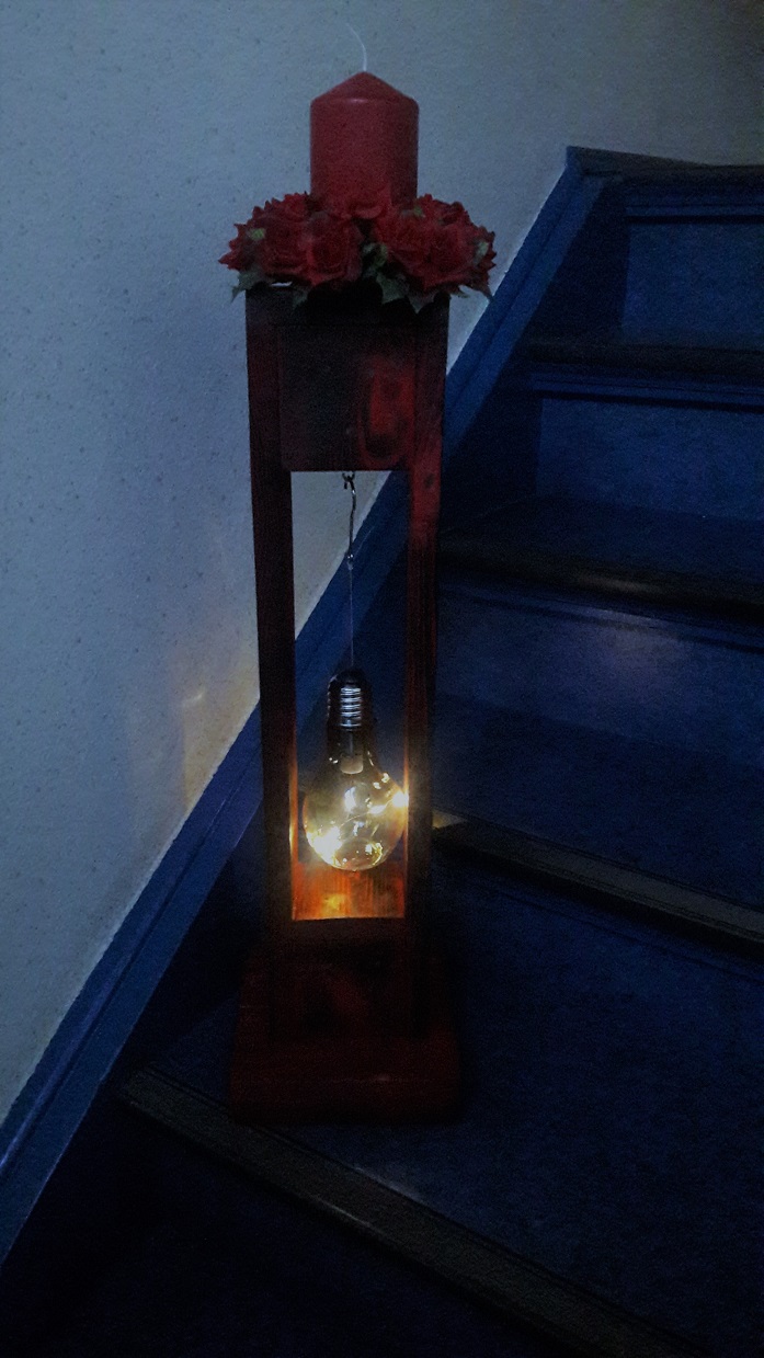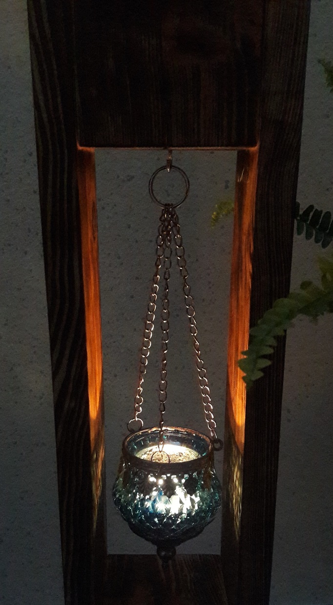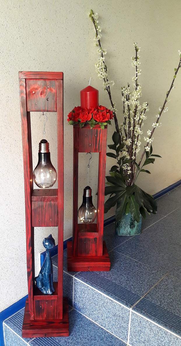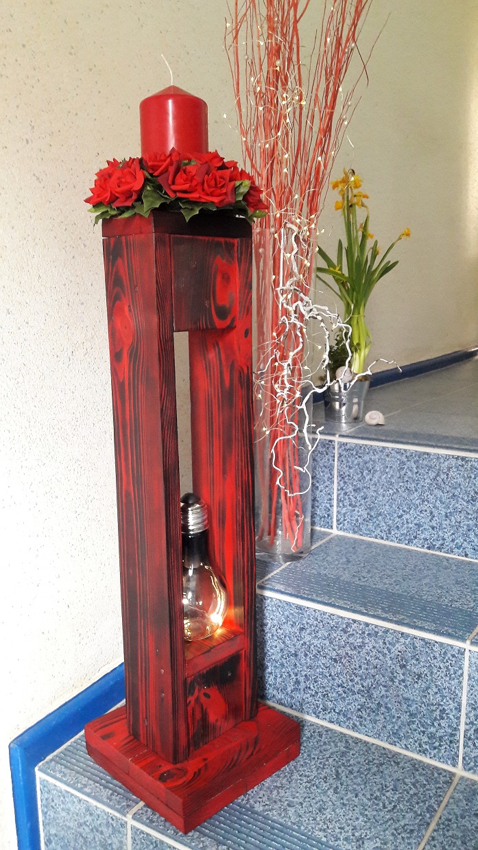 ![]() ![]() Auch die Teelichthalter und der Blumenhalter wurden aus alten Paletten gefertigt. |